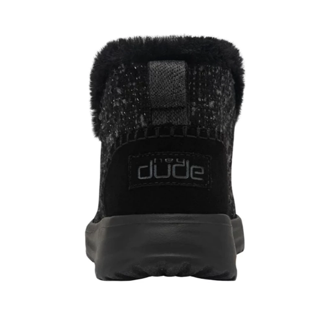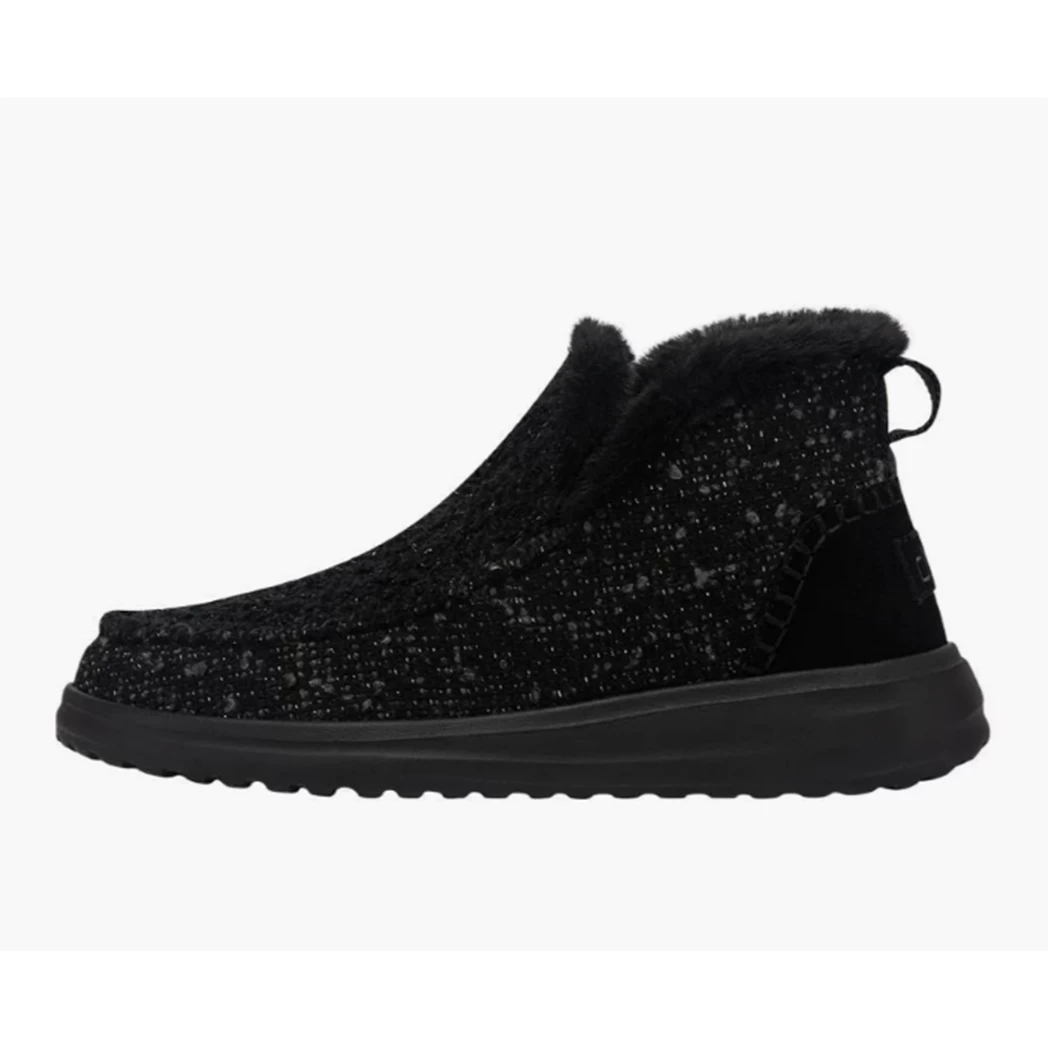 Slip into this ultra comfy Denny Sparkling Black moccasin-inspired bootie from Hey Dude! A soft, subtle bootie constructed in a soft wool blend with plush faux fur lining to keep your feet warm and dry all winter long. Finished off with contrasting, hand-stitched details and glitter-woven finishes throughout.
