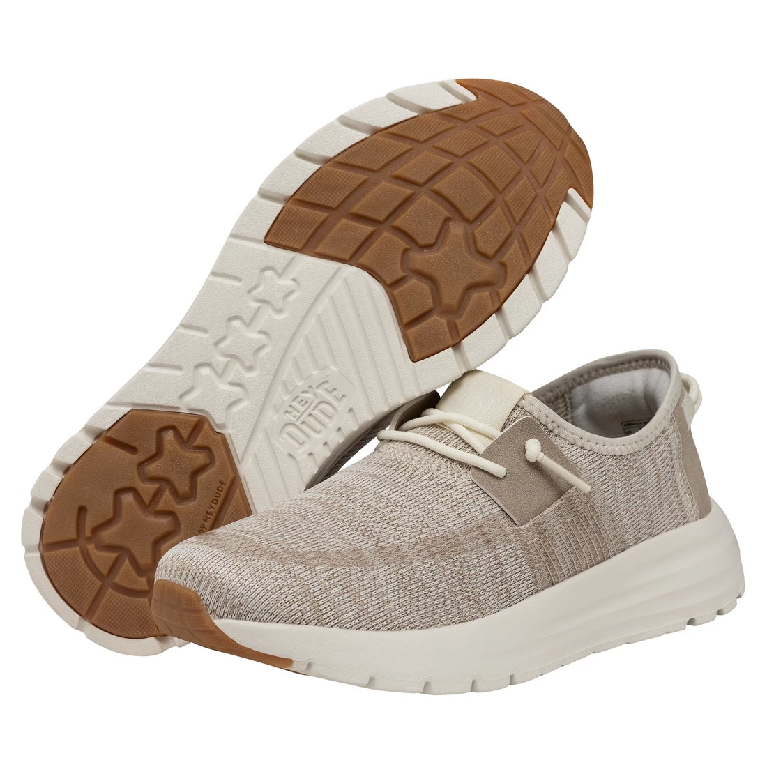 Grab one of the most wanted and loved styles form Hey Dude yet, with the new ladies Hey Dude Sirocco White. Sporty and Stylish, this shoes takes your ordinary sneaker to a whole new level! The Sirocco, features a higher rise than other Hey Dude shoes. It Features a light, stretchy upper and is lined with a breathable, stretch cotton fabric to keep your feet fresh and comfy all day! The outsole has added support, and the fact that the no-tie elastic laces, makes this shoe a true winner