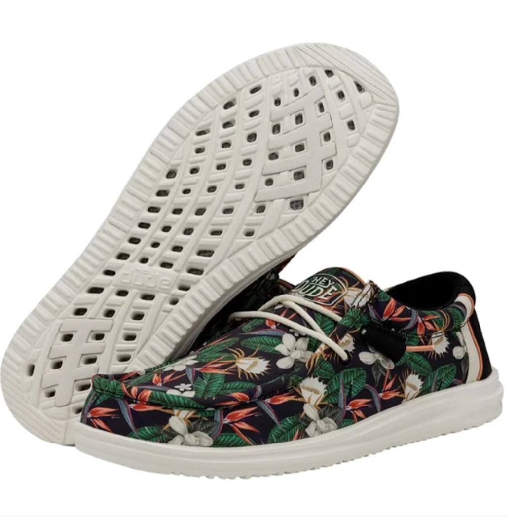 This fun Hey Dude has you ready for all island time ahead. The Wally H2O is Hey Dudes classic moc with a water-ready, oh-so-stretchy, polyester upper and lined with a soft cotton lining for strides that allow you to go with the flow. Elastic laces make the shoes easy to slip on and off and the perforated mesh insole adds an extra layer of cushion and air circulation to the tried-and-true foam outsole.