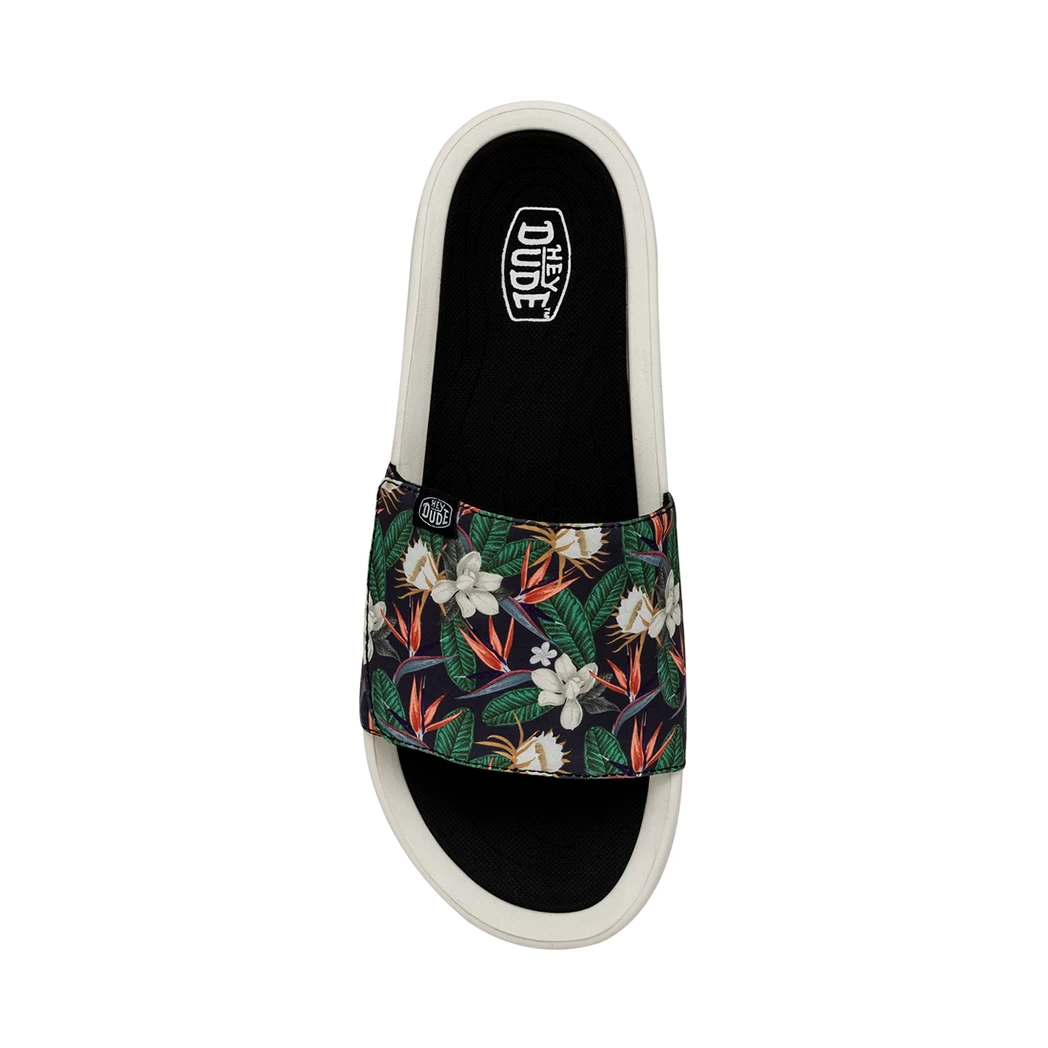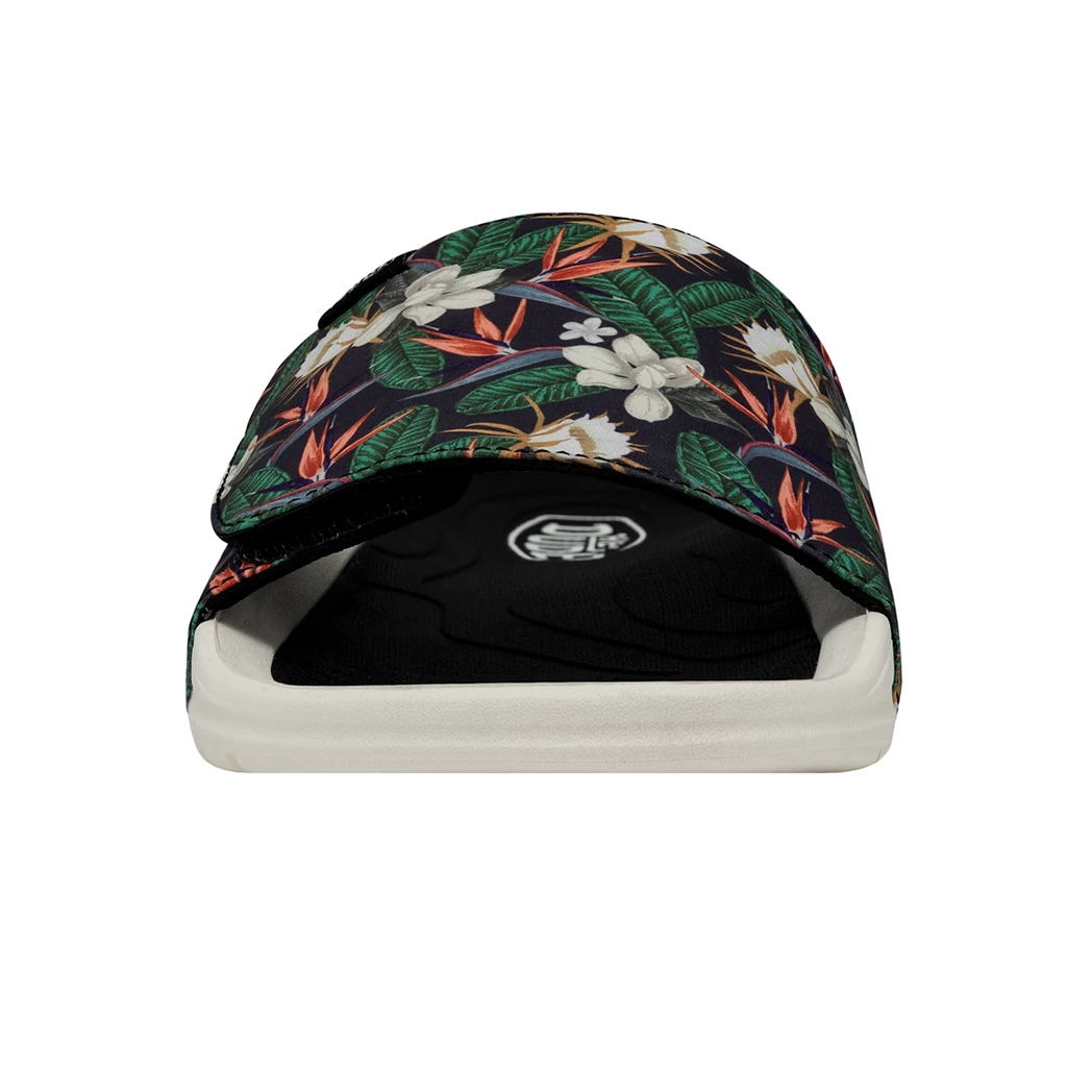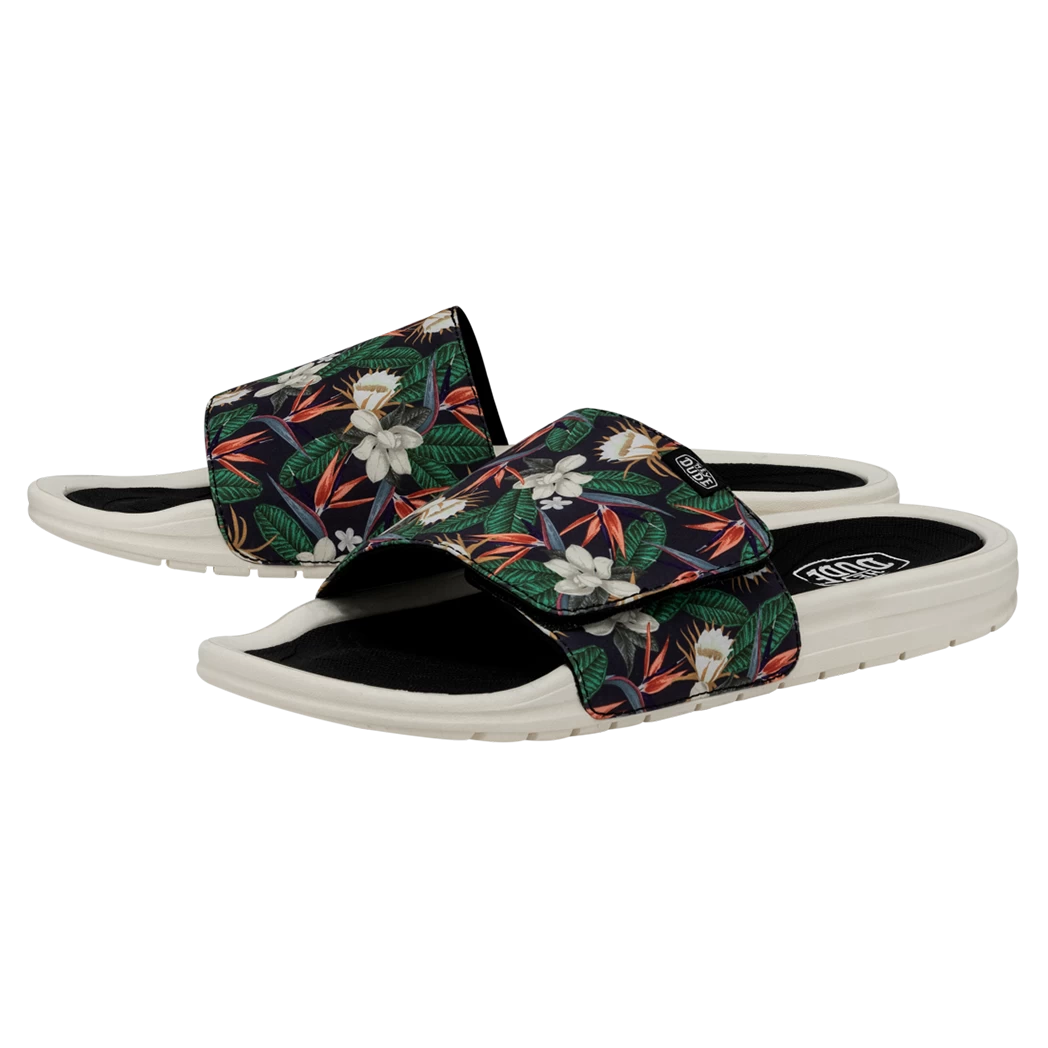 It’s time for some sunshine with these Hey Dude Phoenix Tropical Birds of Paradise Slides! They feature a cotton upper strap that is designed for pure comfort. It also Features a leather-lined foot bed and a lightweight outsole, which makes this slide comfy to for all day wear. Perfect for the beach, lake, or your next bbq, we know you will want to keep your feet up in these all summer long!