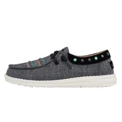 Hey Dudes Rodeo collection never disappoints and these new Wendy Annex Rodeo Black are no exception! A soft cotton canvas with hand-stitched and studded features throughout. Finished off with a suede collar, an ultralight outsole and elastic laces to keep the night goin’ from sunrise to sunset.