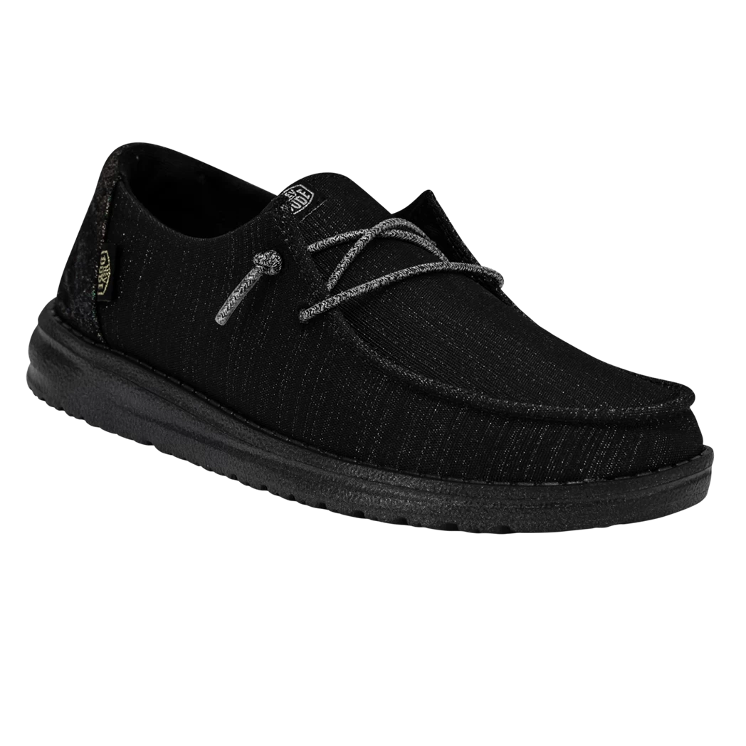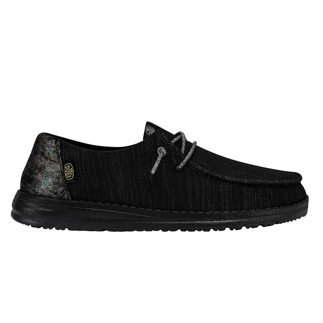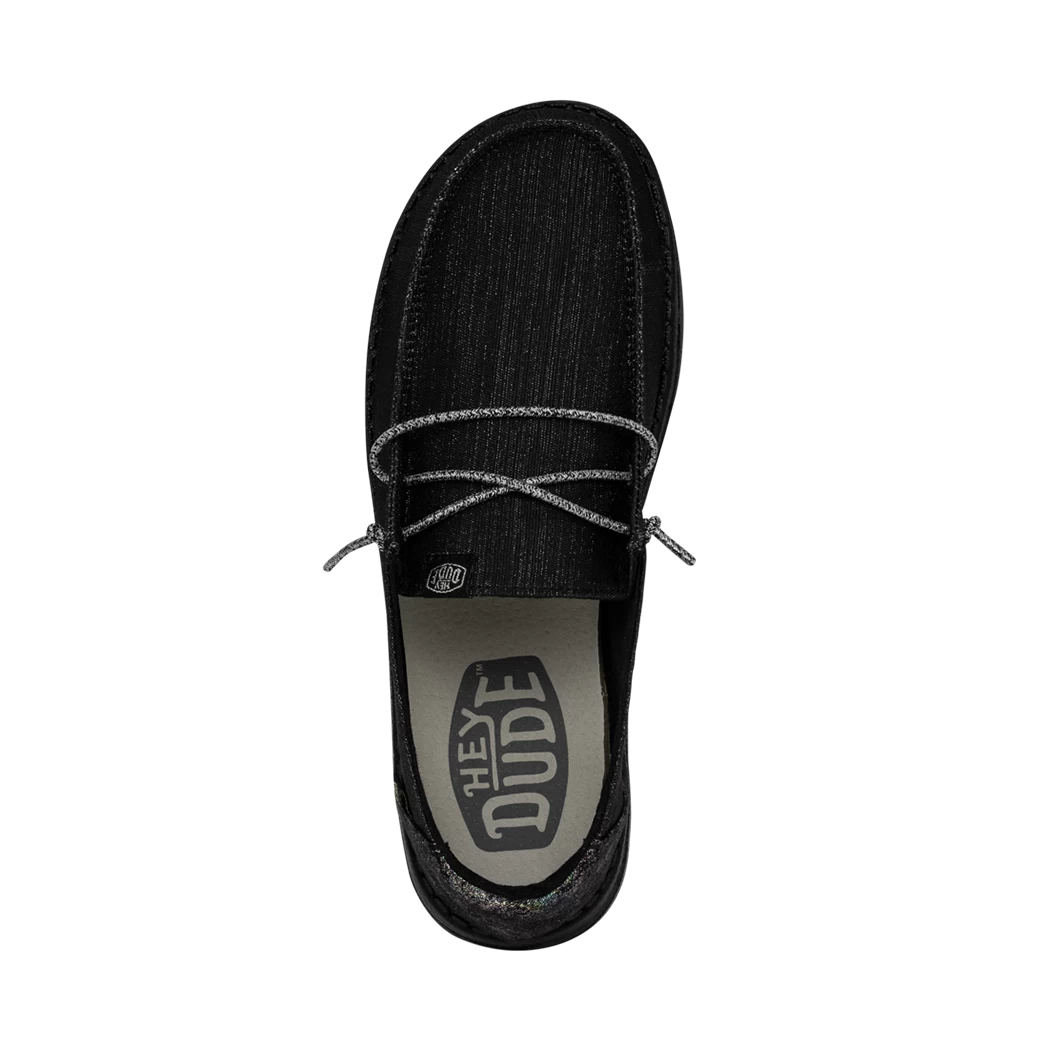 The Hey Dude Wendy Glitter Meteor is made to shine! It features a durable, metallic textile upper in front of a fun glittery heel. This shoe features an extra layer of foam cushion, is lined with a light cotton-blend lining. The Glitter Meteor shoe features the ultralight outsole with easy-on, elastic lacing system, you can count on comfort without lacking style!Â