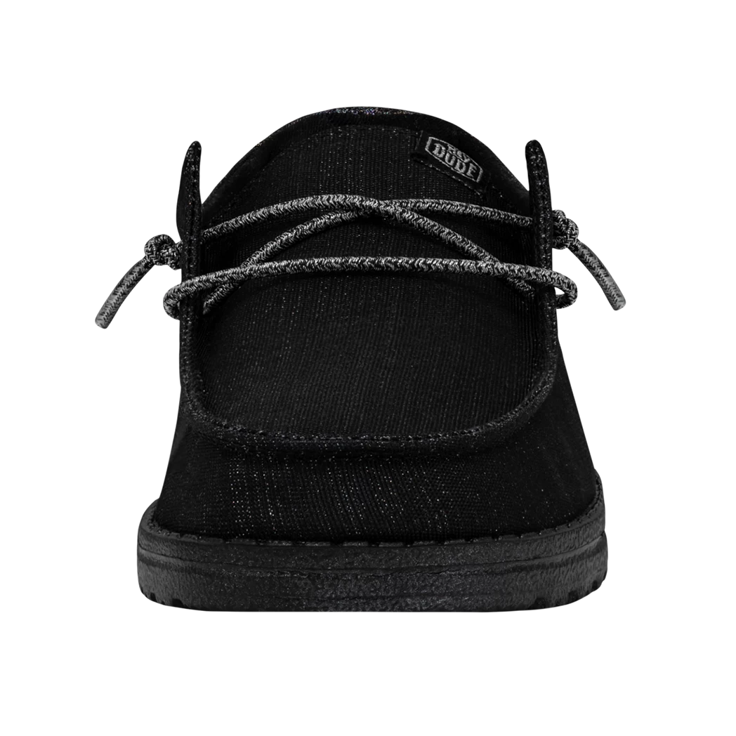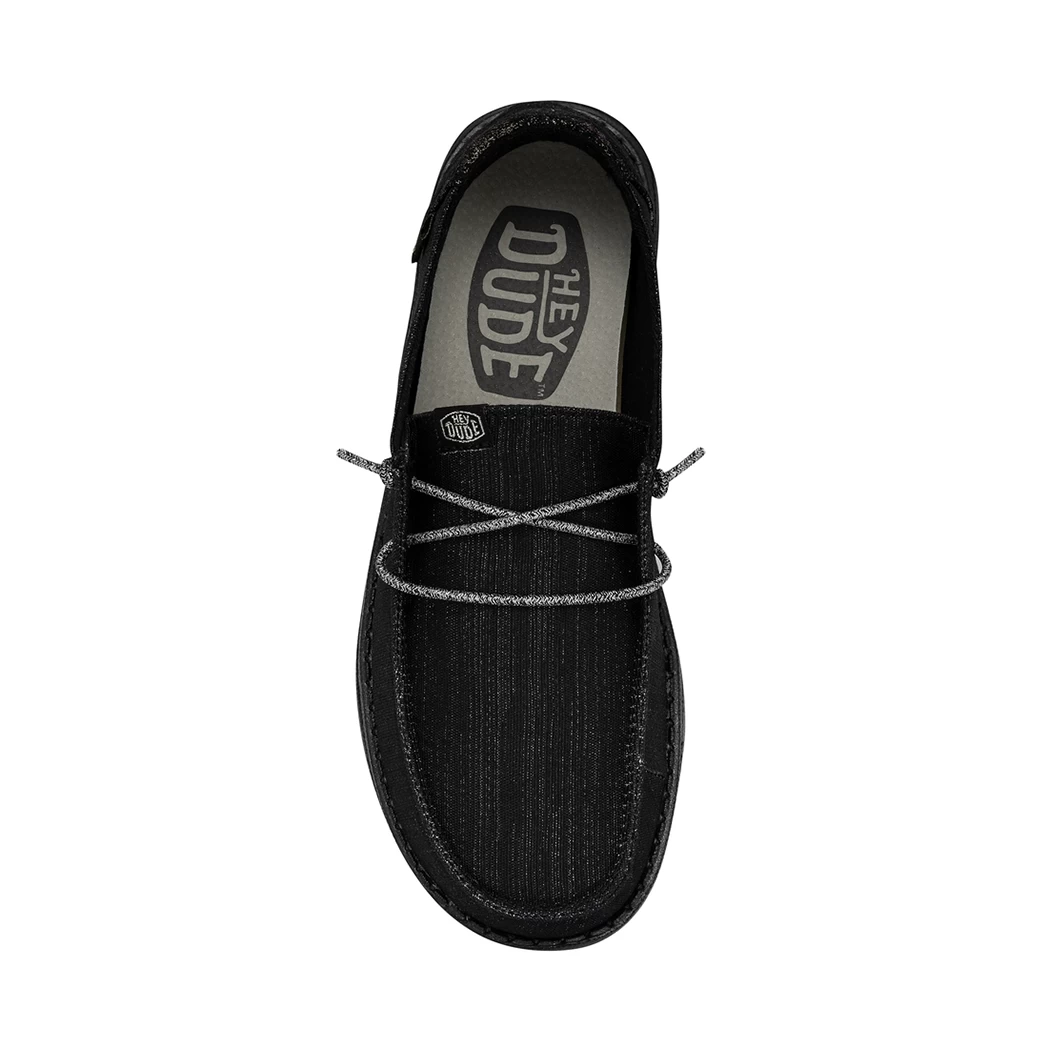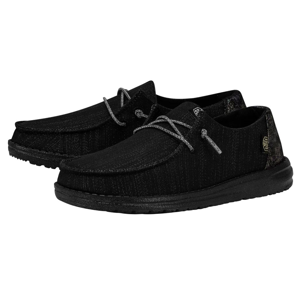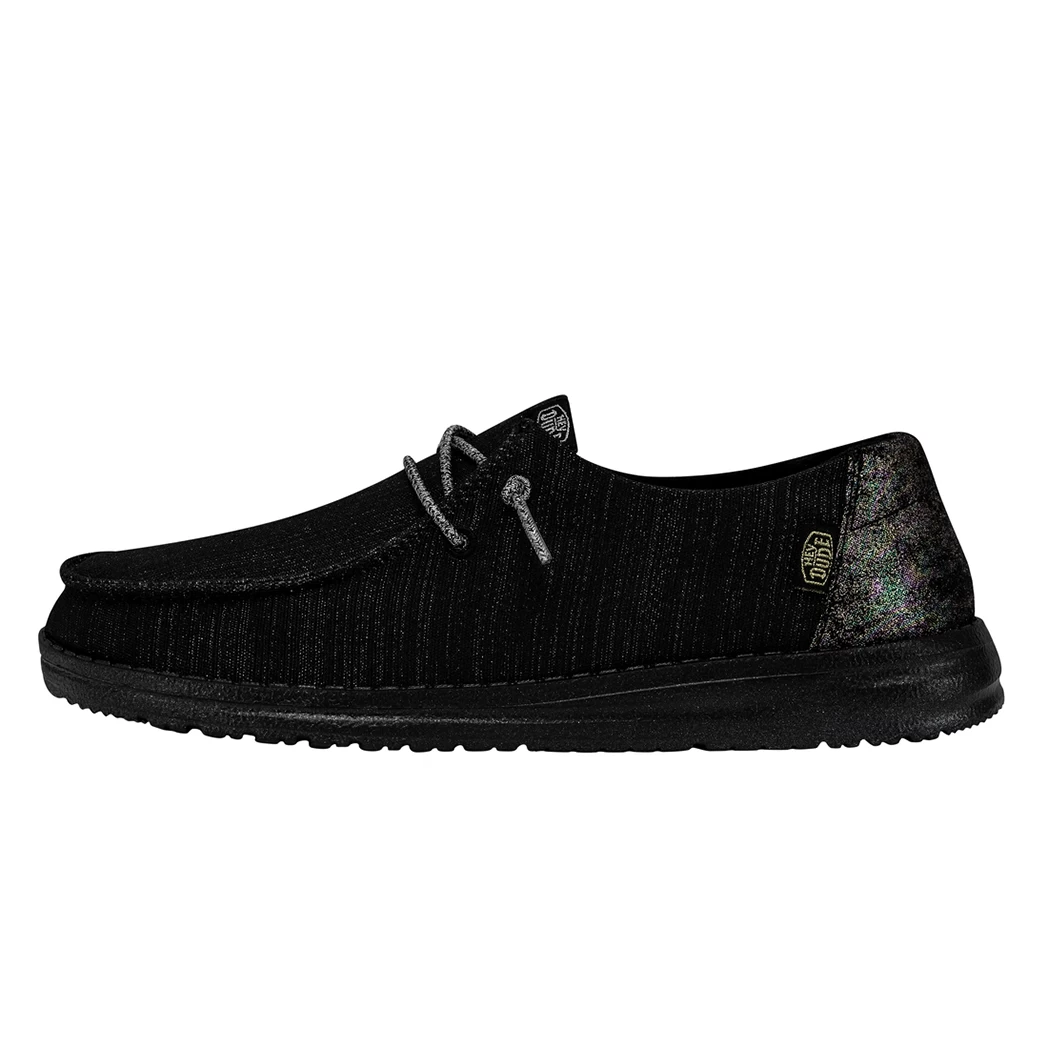 The Hey Dude Wendy Glitter Meteor is made to shine! It features a durable, metallic textile upper in front of a fun glittery heel. This shoe features an extra layer of foam cushion, is lined with a light cotton-blend lining. The Glitter Meteor shoe features the ultralight outsole with easy-on, elastic lacing system, you can count on comfort without lacking style!Â