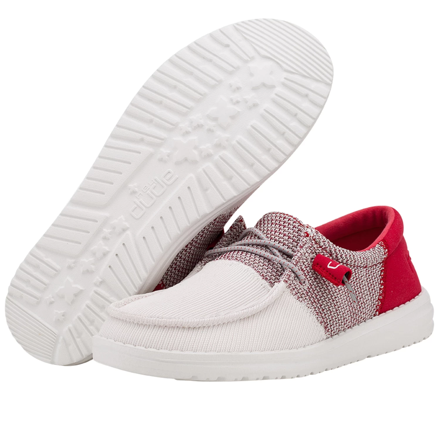 These Wendy Sox Funk White Strawberry Hey Dudes give off such a fun vibe! They are lightweight and made of a breathable material that stretches. The best part is they still give support, while having sock-like comfort. Built on our patented ultralight EVA outsole. Our thoughtfully designed Easy-On System features no-tie elastic laces.